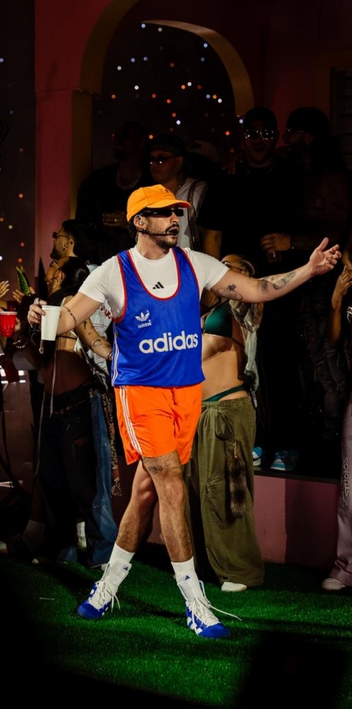 El segundo cambio de ropa trajo una imagen más fresca y relajada: una camiseta blanca de mangas cortas, encima una azul sin mangas y unos pantalones cortos color naranja, acompañados de una gorra a juego. Una combinación que reafirmó el estilo urbano, deportivo y despreocupado que el artista ha escogido para esta gira.