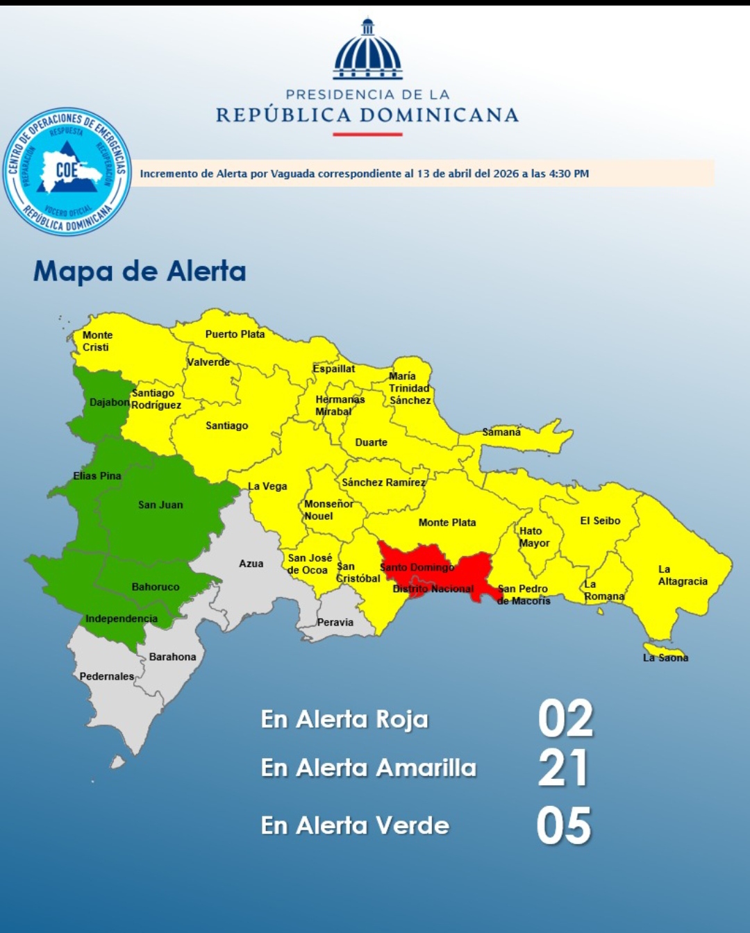 El Centro de Operaciones de Emergencias (COE) colocó en alerta roja a la provincia Santo Domingo y el Distrito Nacional mientras que mantiene otras 21 en amarilla y cinco en verde, debido a que una vaguada combinada con la humedad que proporciona el viento de dirección noreste provocará aguaceros moderados a fuertes en el transcurso de la tarde y de la noche.