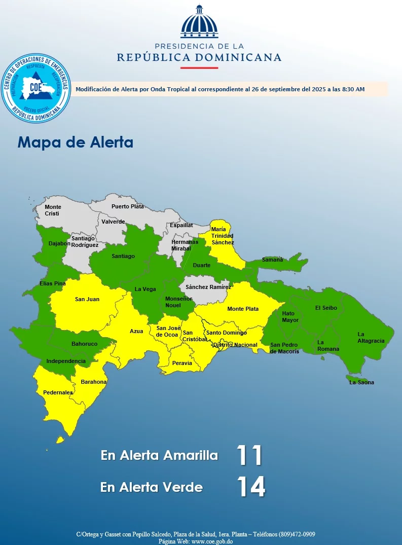 El Centro de Operaciones de Emergencias (COE) informó que se mantienen los niveles de alerta amarilla y verde para 24 provincias del territorio nacional, debido a la gran cantidad de humedad en la masa de aire y la inestabilidad generada por los efectos indirectos del potencial ciclón tropical número 9, que continúa alejándose del país.