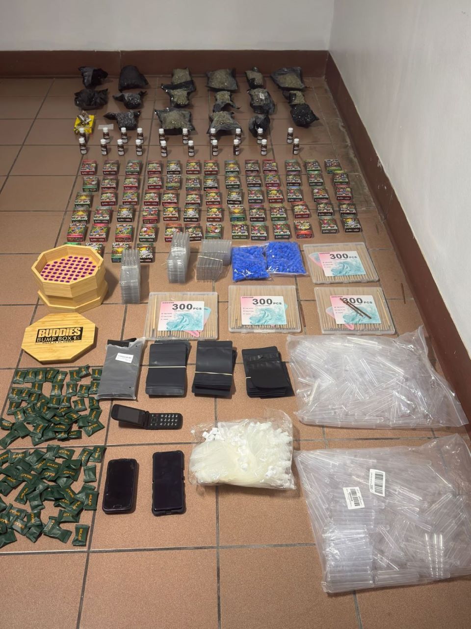 Posteriormente, por instrucciones del fiscal actuante, se procedió a abrir el equipaje, ocupándose en su interior 17 paquetes presumiblemente de marihuana; 29 vapers rellenos de un líquido que aparenta ser de la misma sustancia; decenas de cajas de papel y bolsas para enrolar; 20 frascos de tabaco; 90 sobres de estimulantes; dos paquetes de tubos y tres teléfonos celulares, entre otras evidencias.