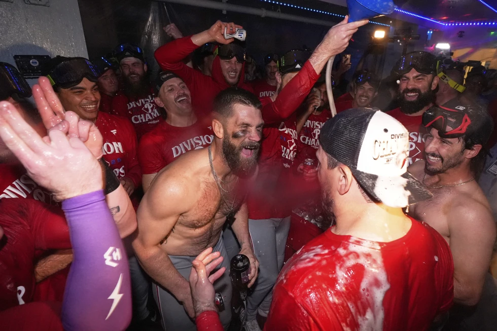 Un Bryce Harper sin camiseta vertió una botella de champán sobre su cabeza, disfrutando del segundo título consecutivo de la División Este de la Liga Nacional de los Filis de Filadelfia.