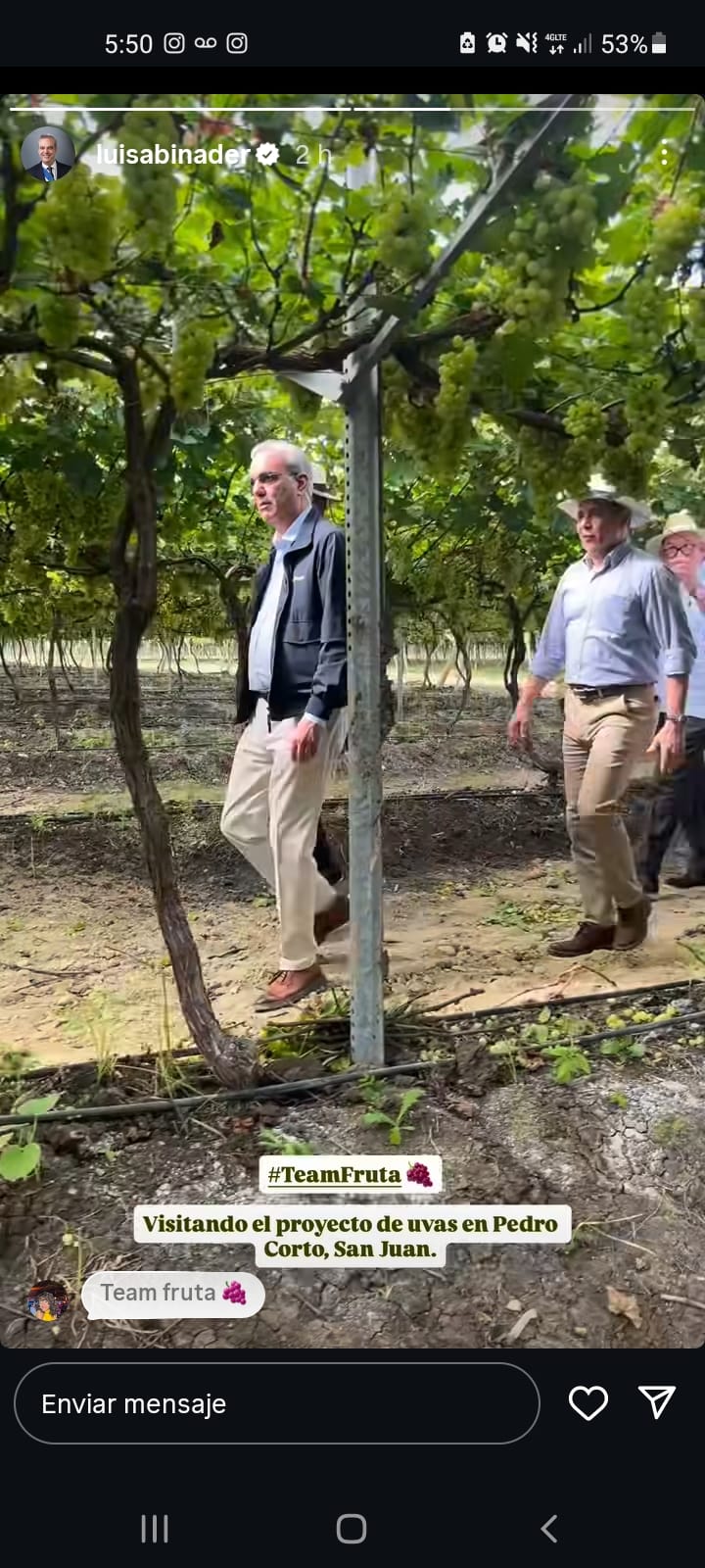 “En Pedro Corto conocimos el proyecto Uvas San Juan, una iniciativa que demuestra el talento y la capacidad de innovación del campo dominicano 🍇. Es parte del Plan San Juan y ya produce las primeras uvas sin semillas certificadas del país. Un orgullo que nos impulsa a seguir apoyando el desarrollo agrícola. #TeamFruta”, escribió Abinader.