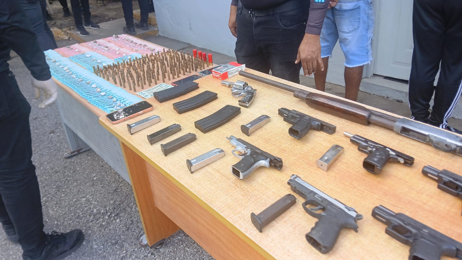 Los allanamientos se realizaron en el distrito municipal de Bahoruco y en el municipio de Paraíso, provincia Barahona, donde fueron detenidos Joel Osvaldo Piña y Nicanol Antonio Medina Abreu. En las viviendas intervenidas, las autoridades ocuparon seis pistolas de distintas marcas y calibres, un revólver calibre .357, una escopeta calibre 12, tres cargadores para fusil calibre 5.56, 173 municiones de diversos calibres, un cargador con capacidad para 26 municiones, además de una suma de dinero en efectivo aún no contabilizada y tres celulares.