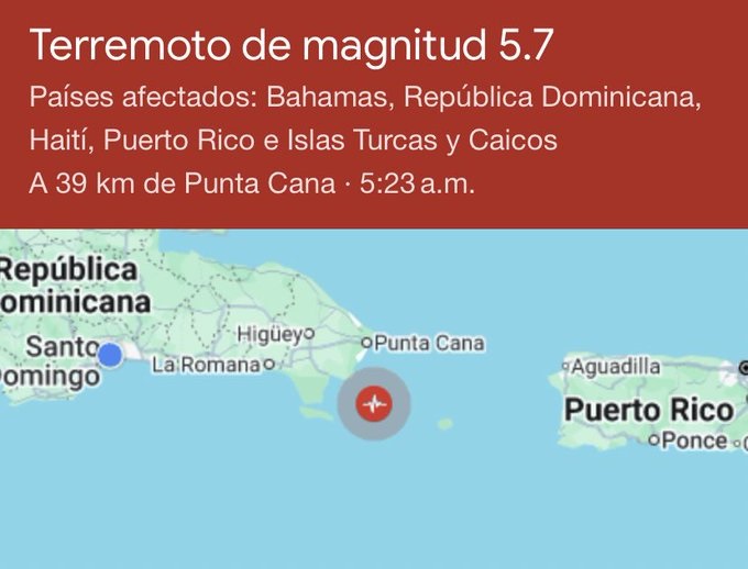 Un temblor de tierra de magnitud preliminar 5.7 se registró la mañana de este martes y fue percibido en diversas localidades de República Dominicana.